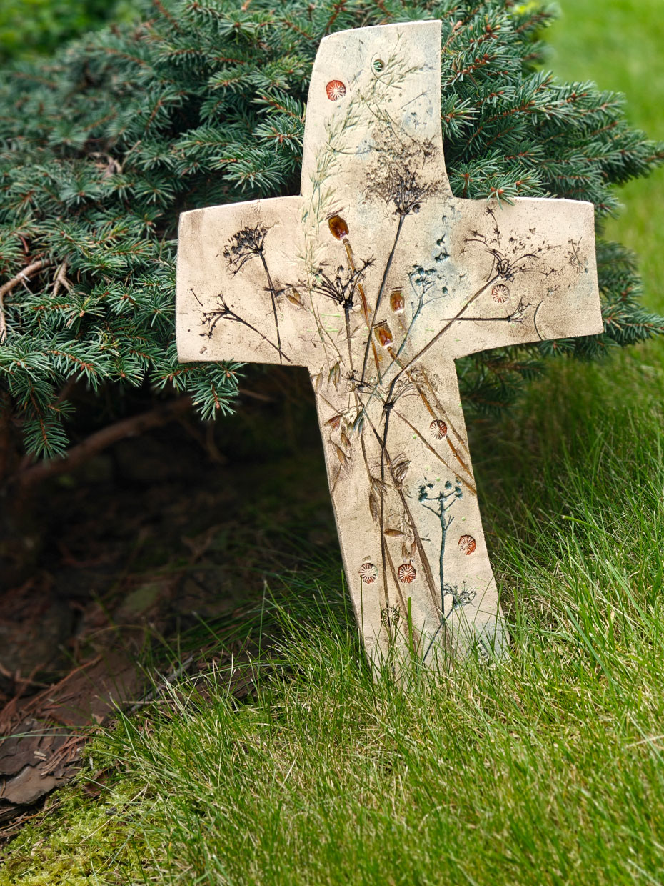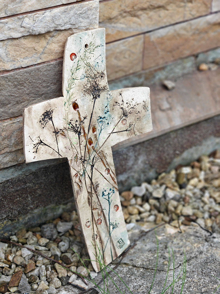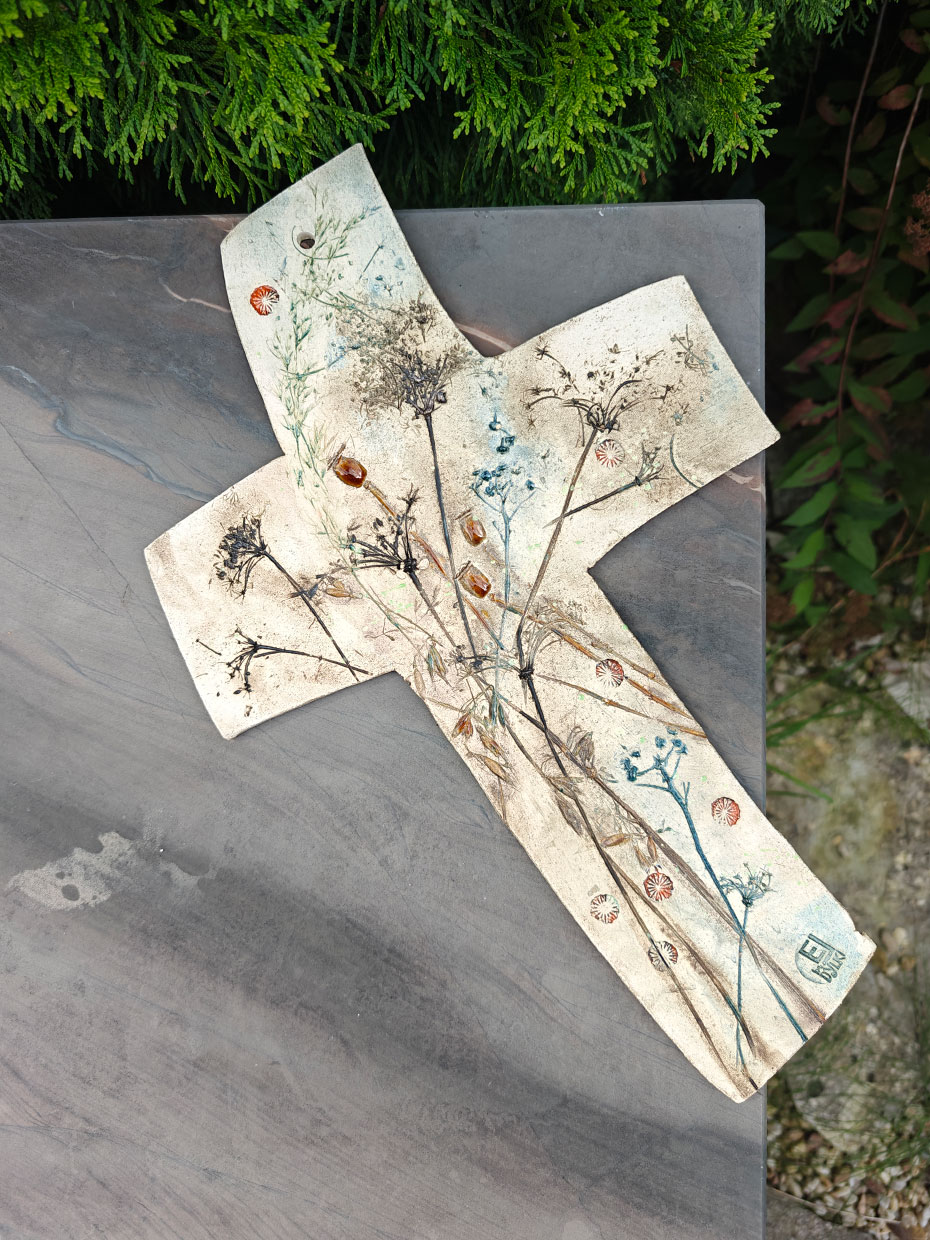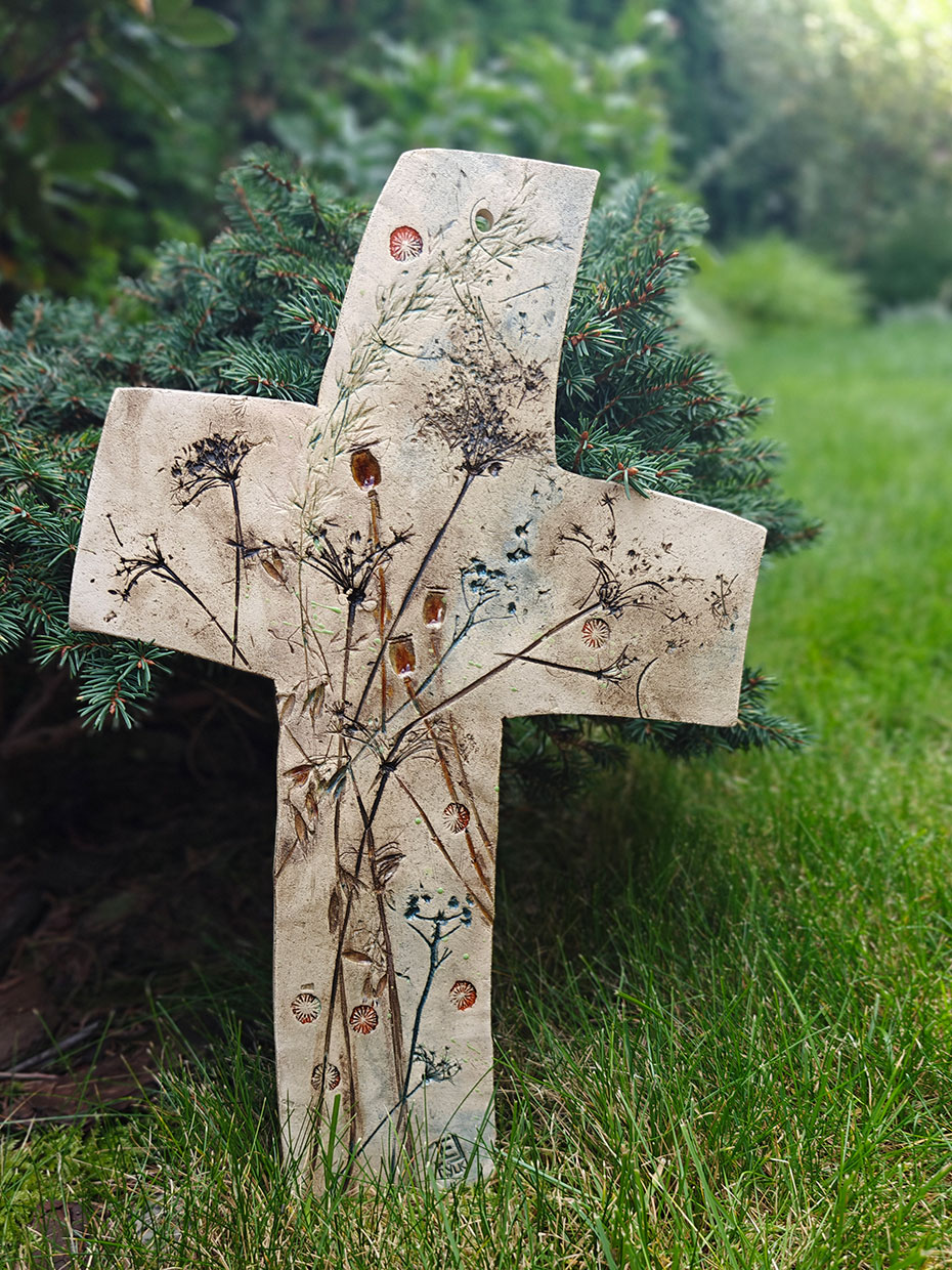 Oryginalny ceramiczny KRZYŻ nazwany „polnym” ze względu na przewodni motyw pól i łąk. Krzyż z autorskiej kolekcji, ręcznie robiony i szkliwony.