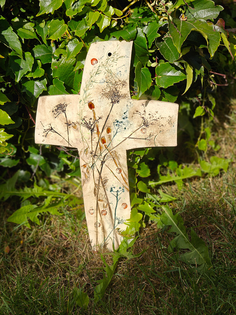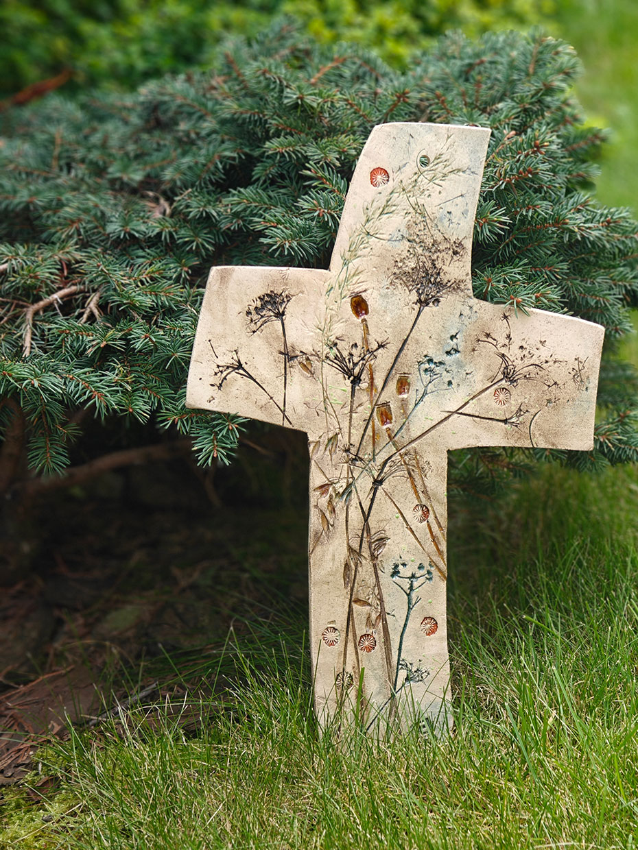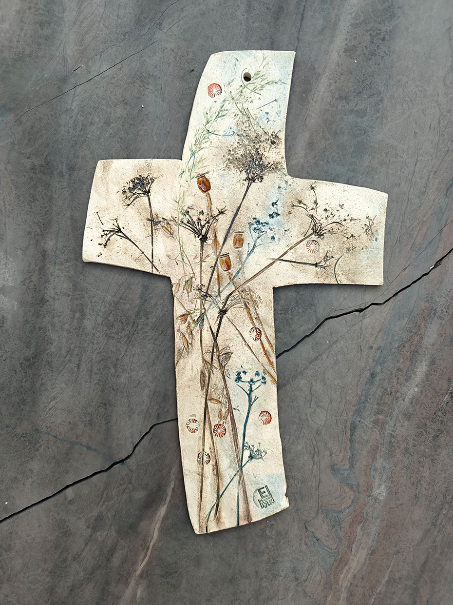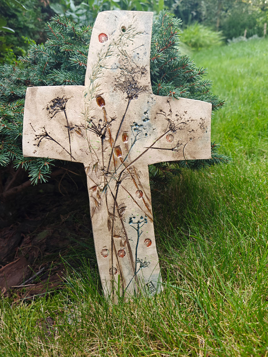 Oryginalny ceramiczny KRZYŻ nazwany „polnym” ze względu na przewodni motyw pól i łąk. Krzyż z autorskiej kolekcji, ręcznie robiony i szkliwony.